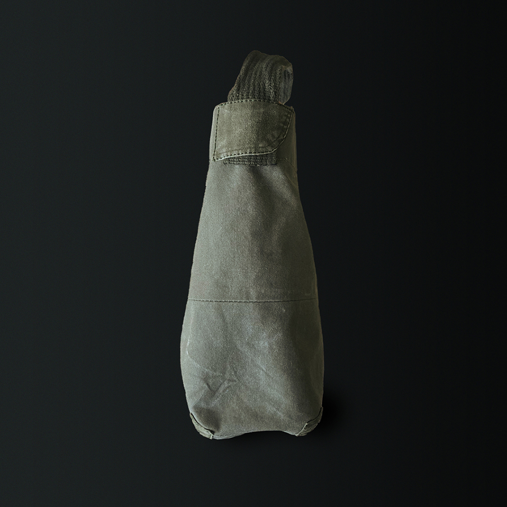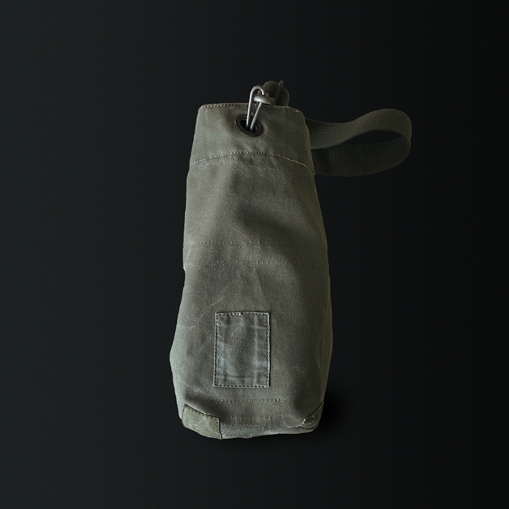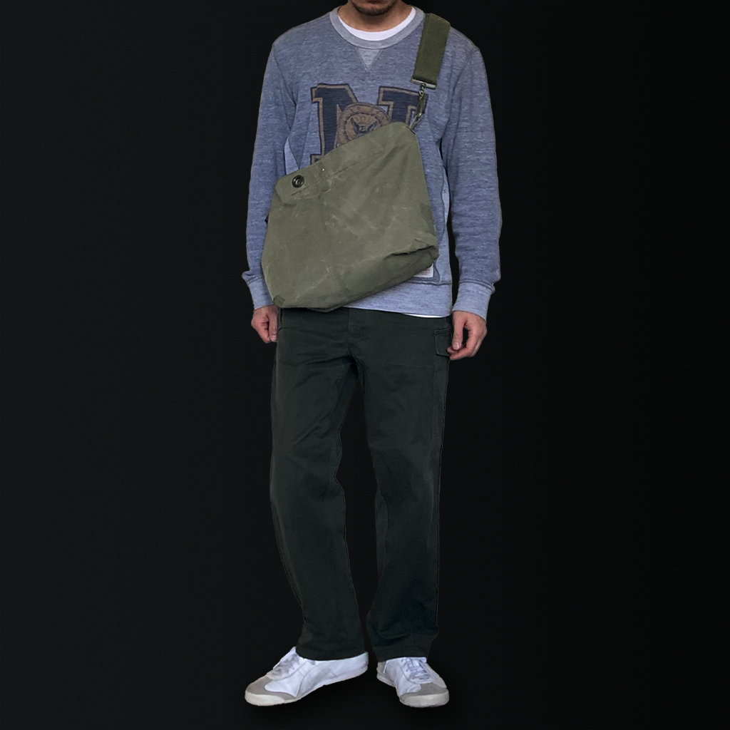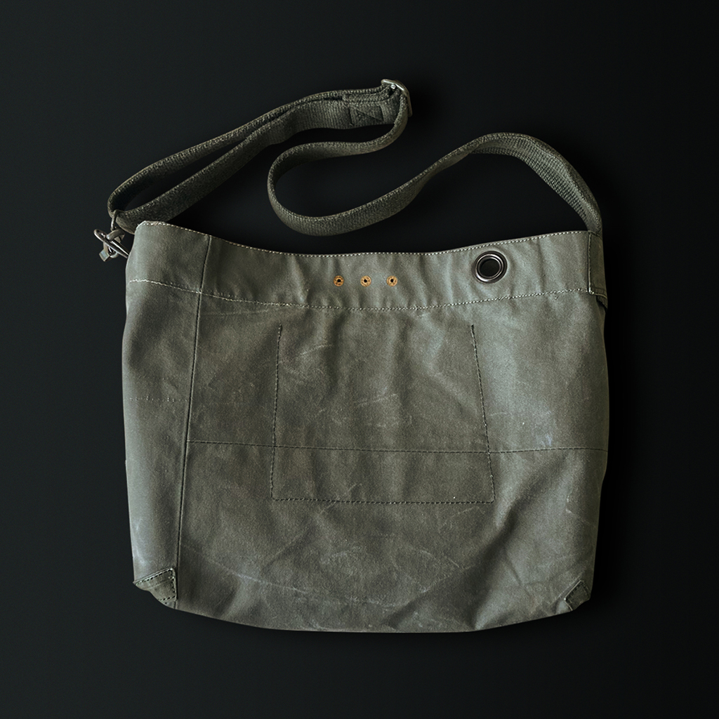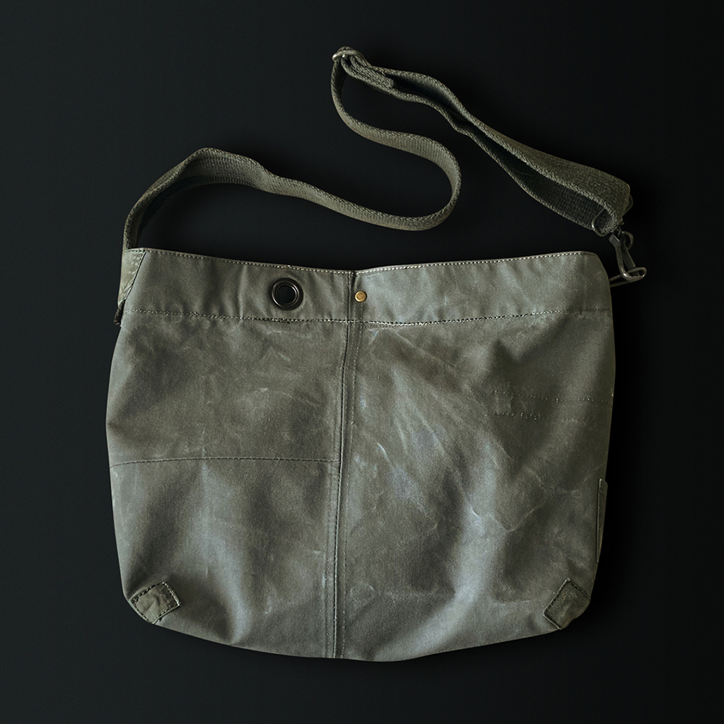 A large and sturdy French army duffel bag made in the 1980s was dismantled to create a middle-size shoulder bag that is easy to use in everyday life.