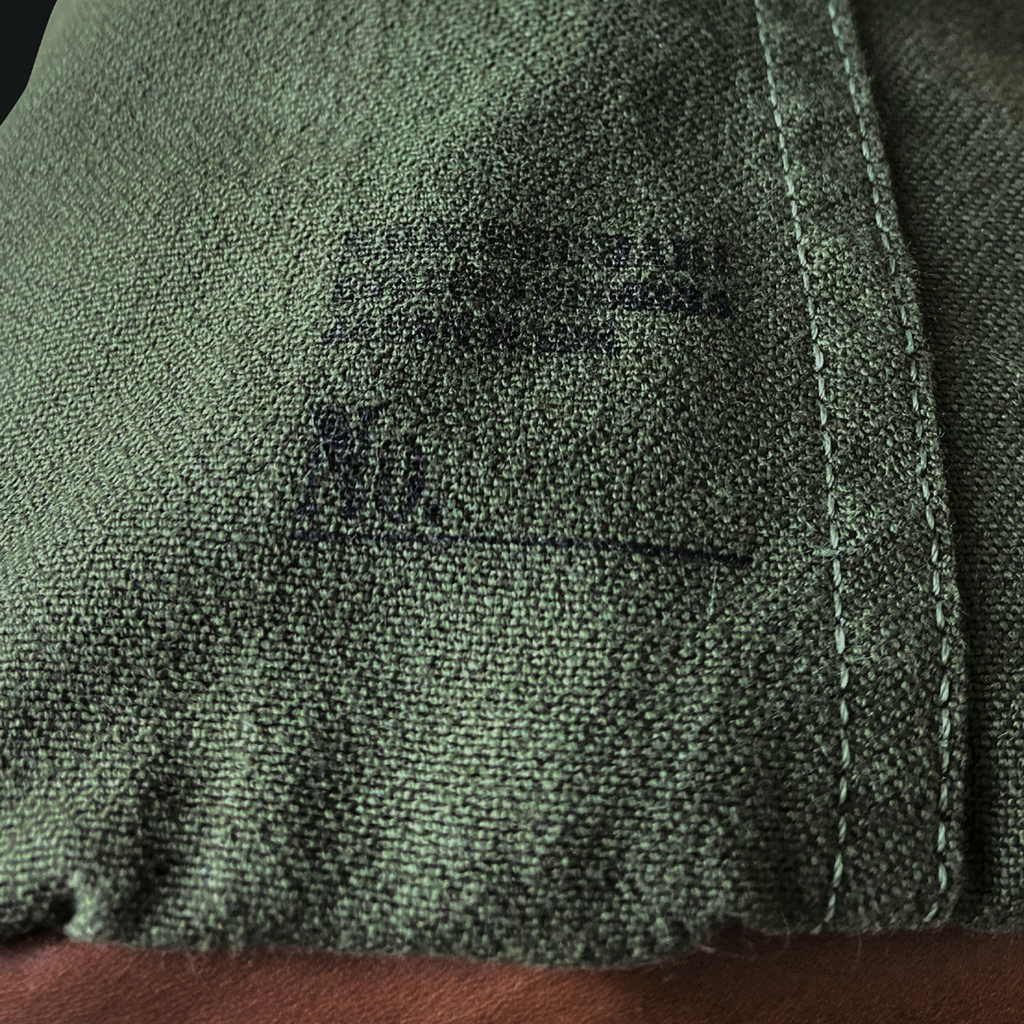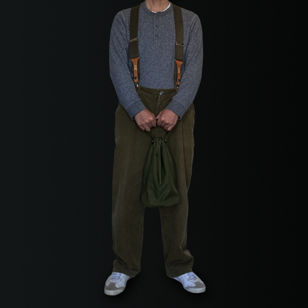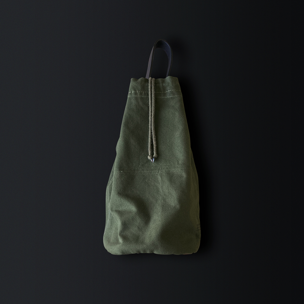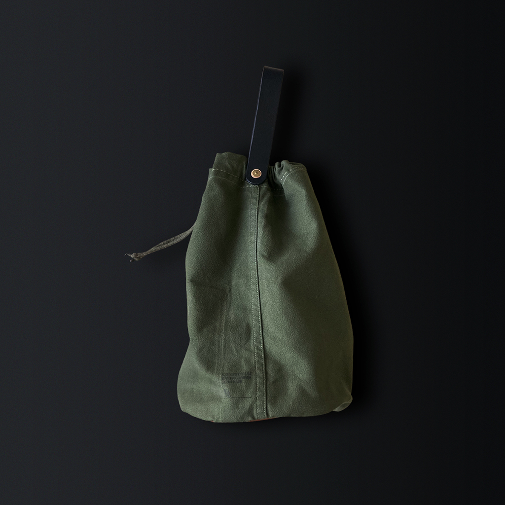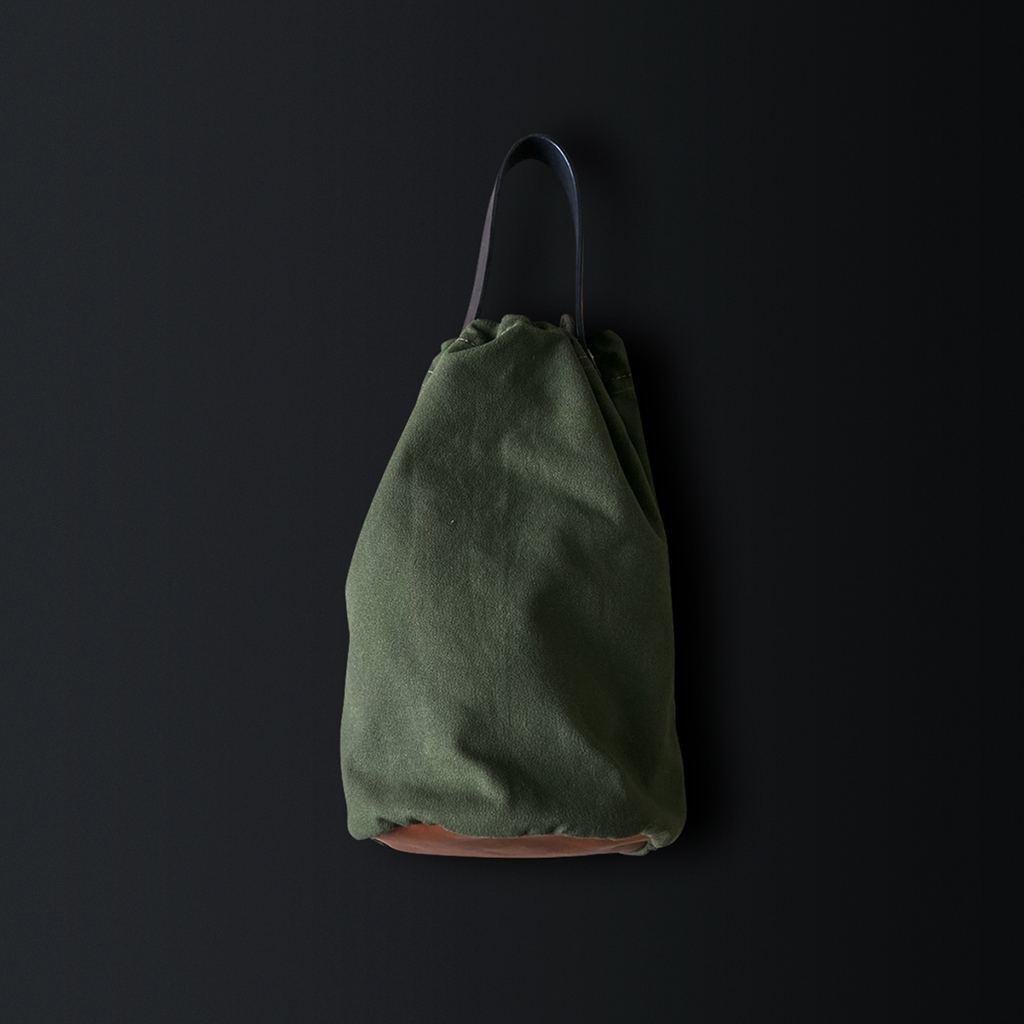 A small bucket-shaped tote bag that is easy to carry with one hand, utilizing the nylon-cotton fabric used in M65 and other products.