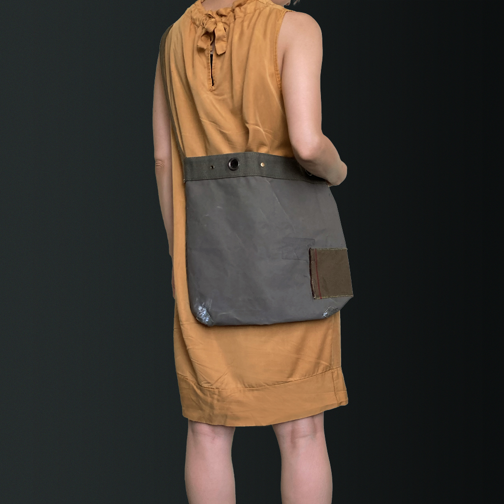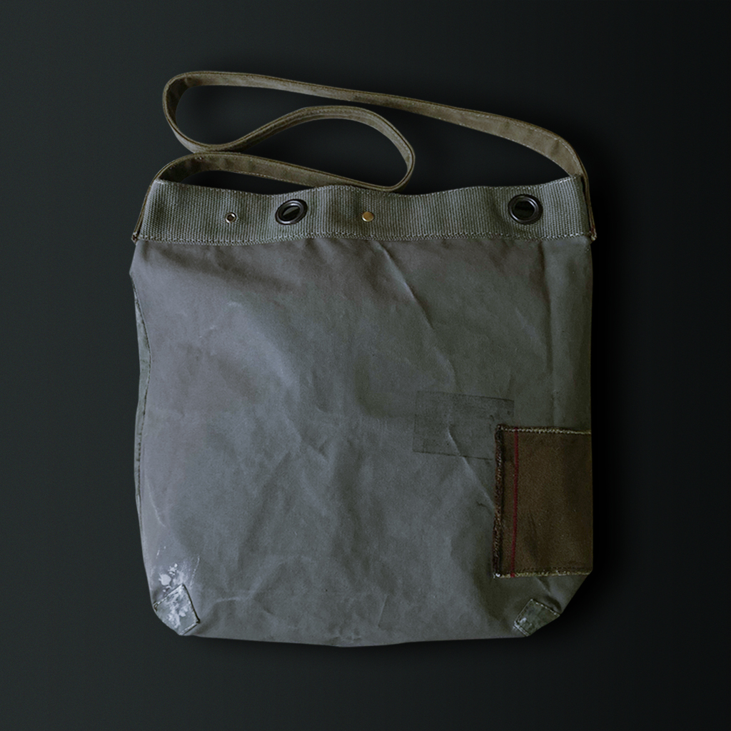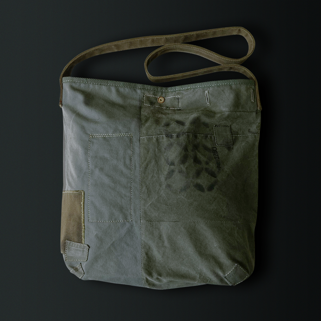 Shoulder bag combining materials such as tent fabrics, army jackets, and duffel bags from various countries.