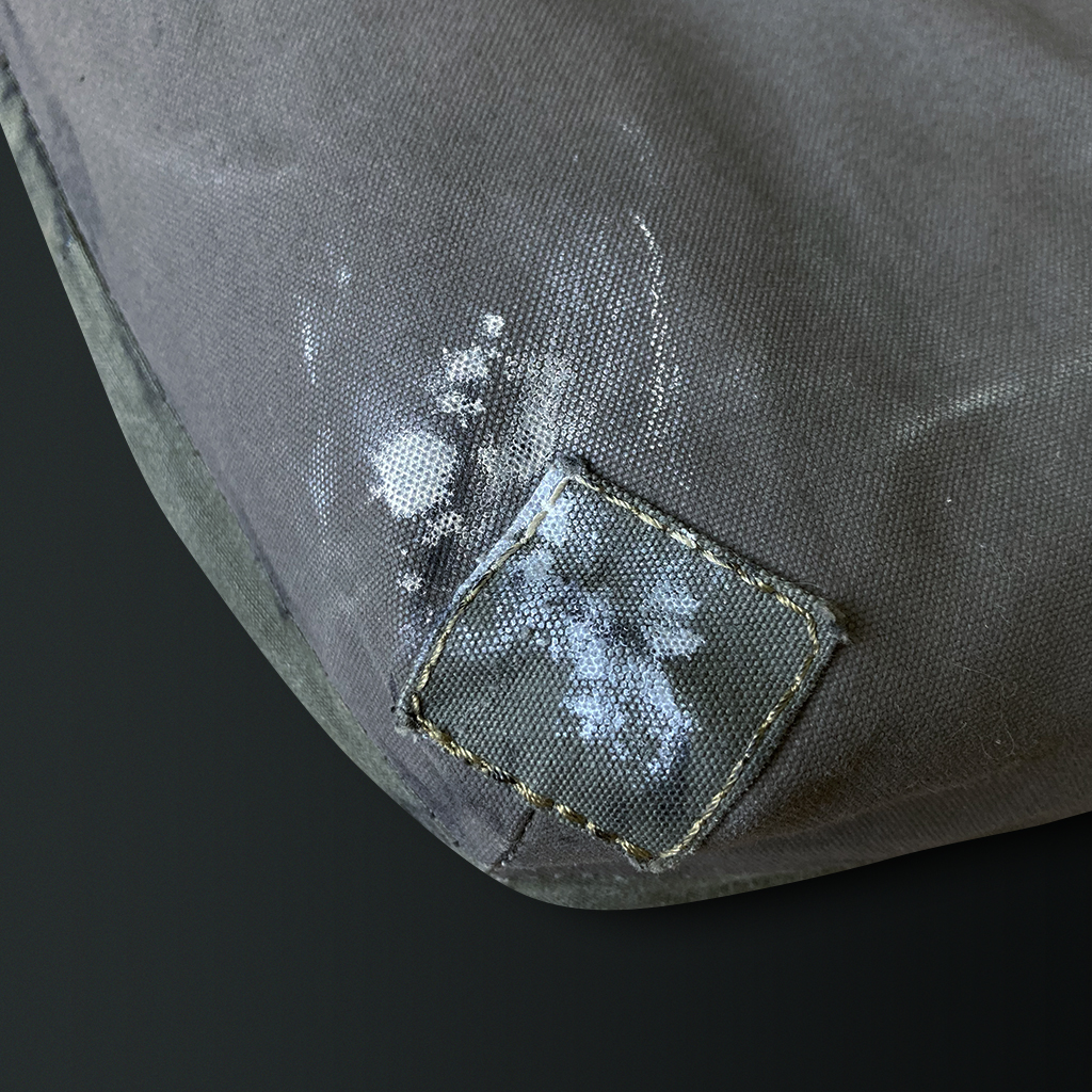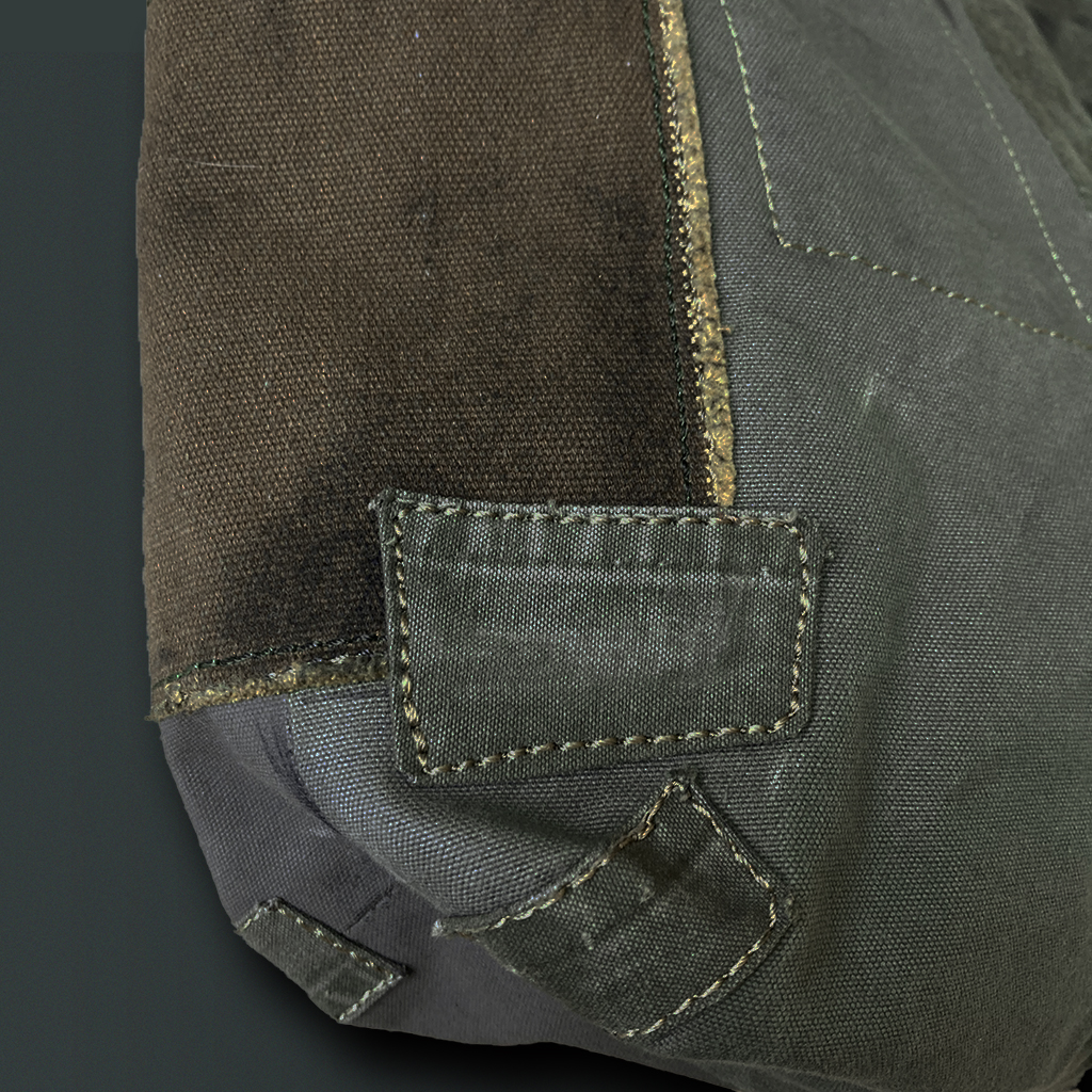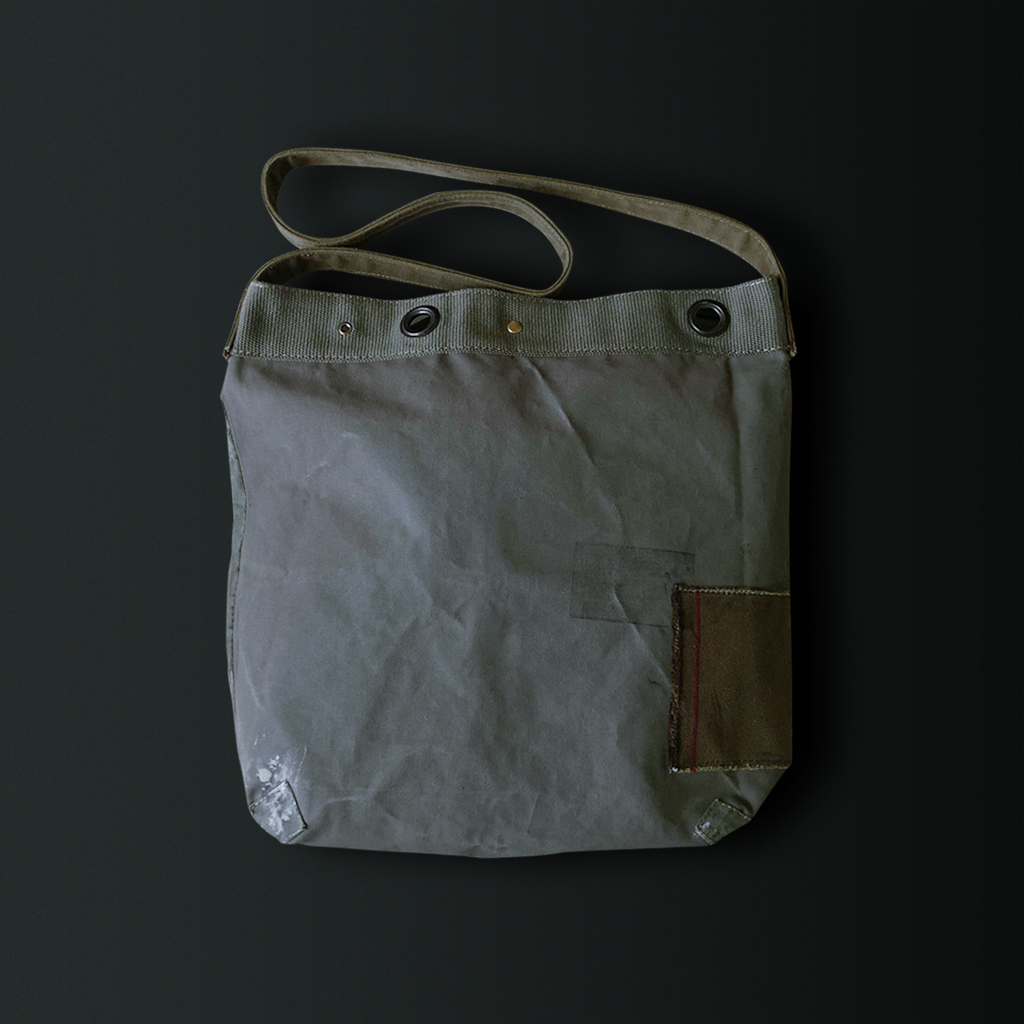 Shoulder bag combining materials such as tent fabrics, army jackets, and duffel bags from various countries.