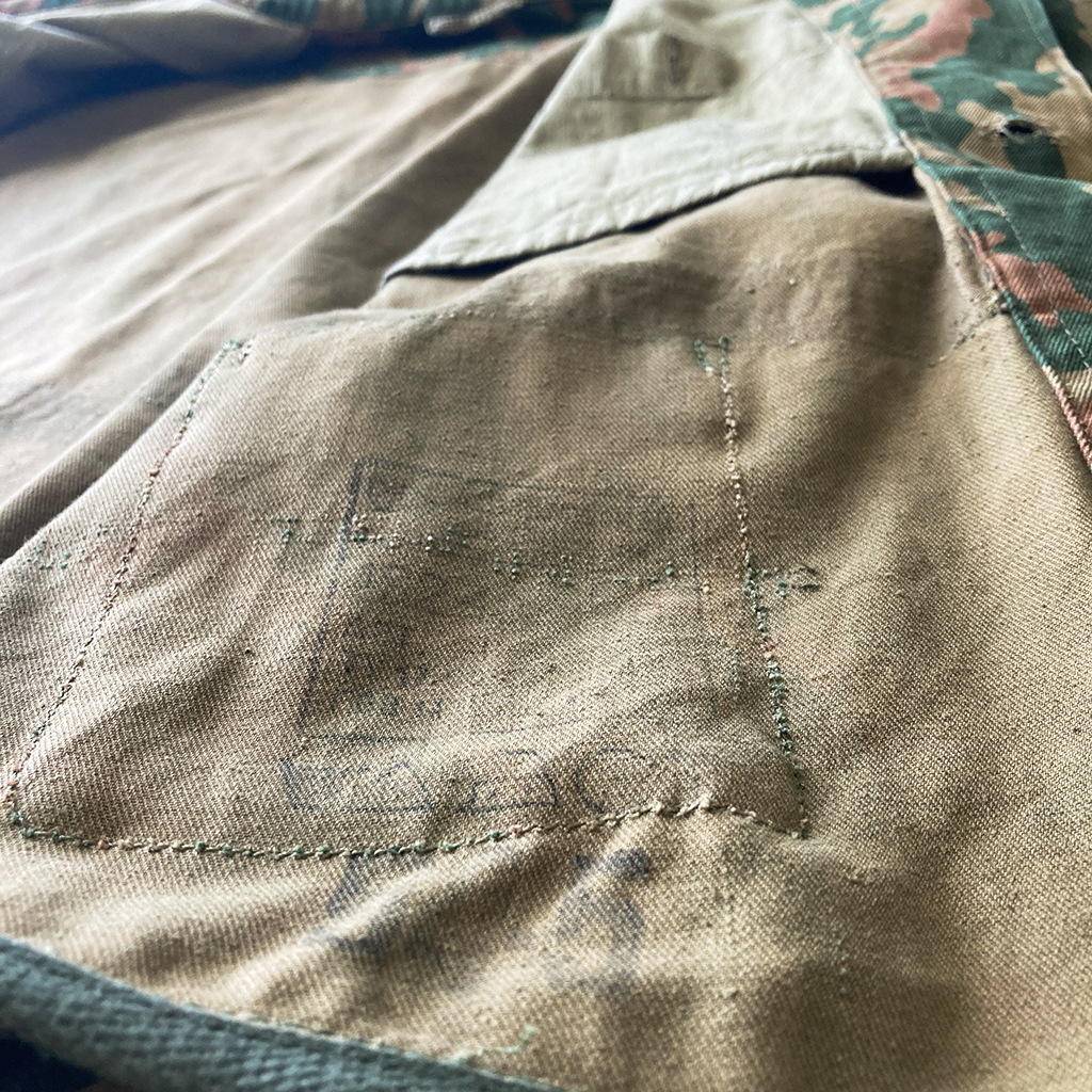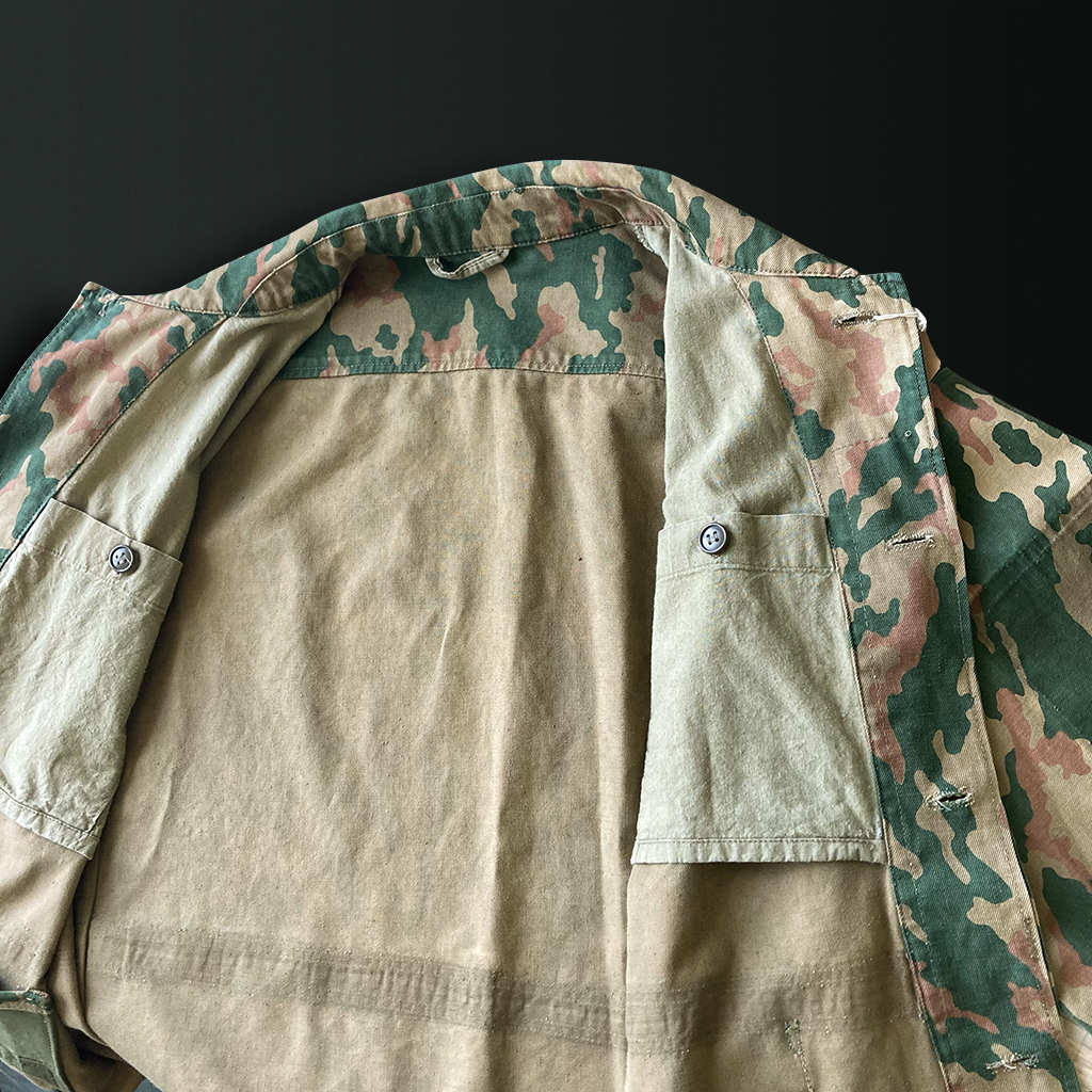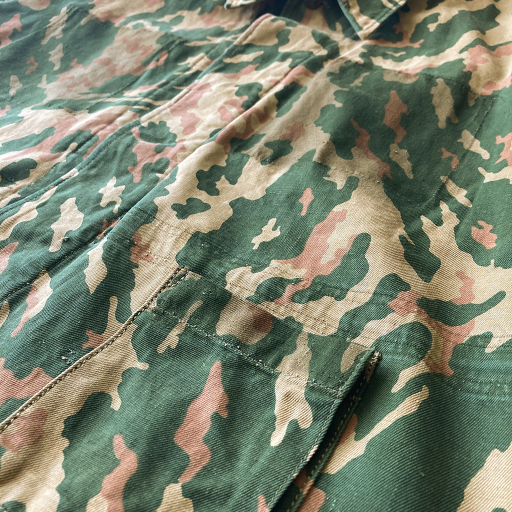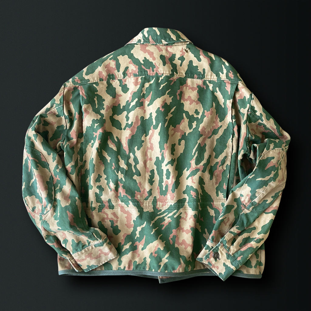 This is a camouflage jacket originally designed for mountain troops, commonly known as the “VSR” or “Schofield”. It is a rare piece, best known for its distinctive, diagonally flowing camouflage pattern.