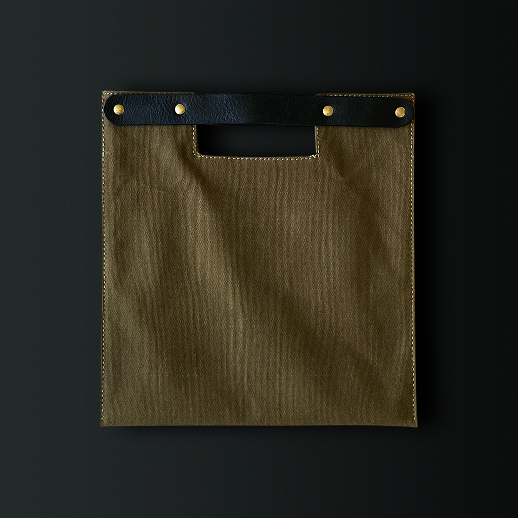Inspired by military document bags, this minimal flat bag is meticulously crafted from durable linen canvas, complemented by sturdy cowhide leather handles and striking brass hardware. Its thoughtfully structured form retains a unique military-inspired aesthetic, making it perfect for carrying your daily essentials or a small tablet.