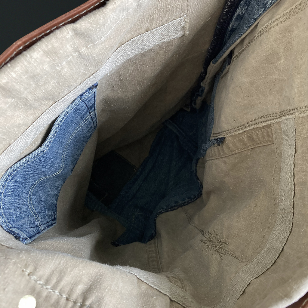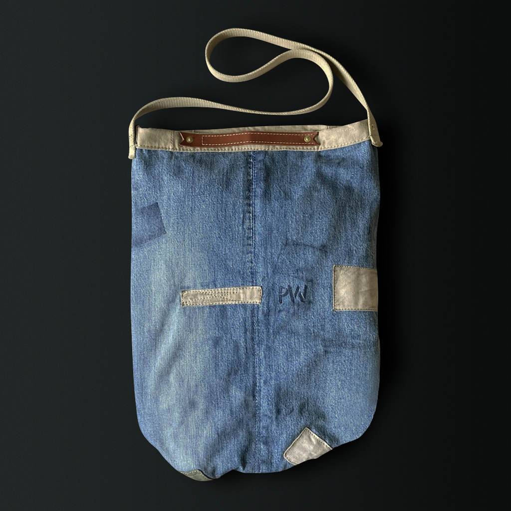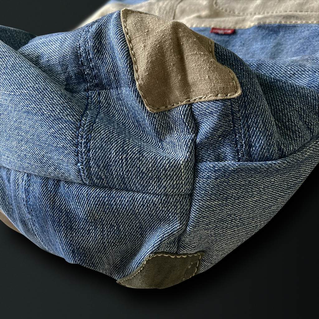 Inspired by the rugged burlap sacks once used in banks, this tote bag is crafted from well-worn denim. The unique texture of the aged denim, combined with patches of army tent fabric and other vintage materials from the same era, creates a fascinating contrast.