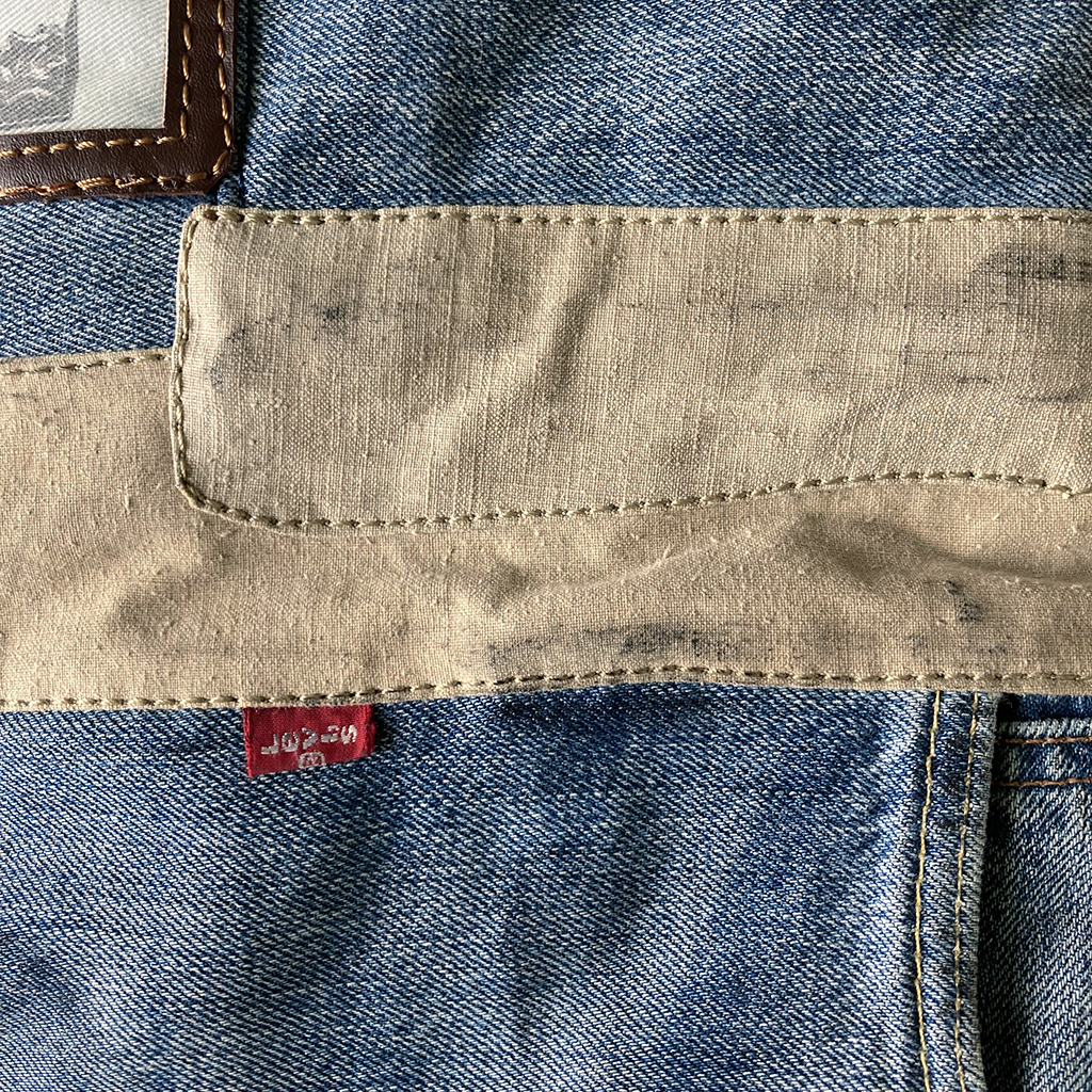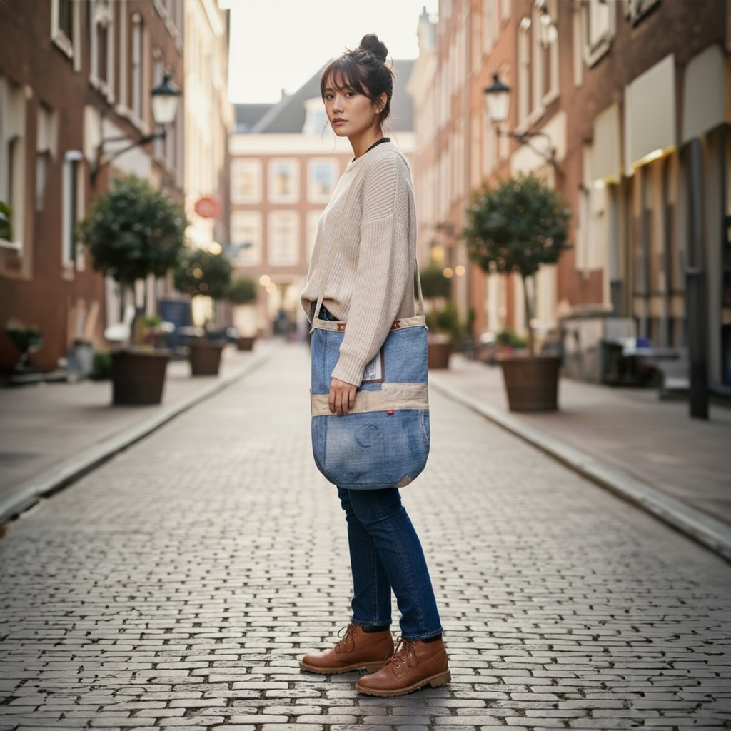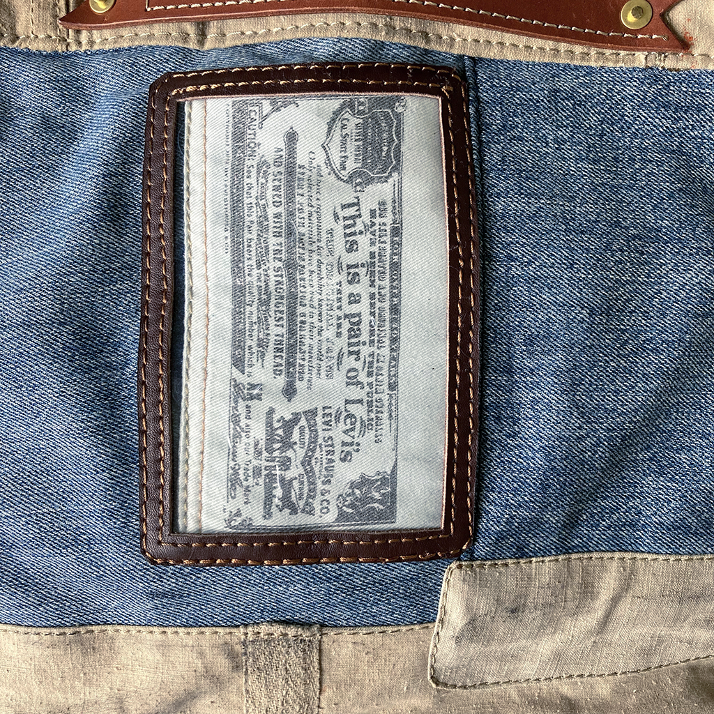 Inspired by the rugged burlap sacks once used in banks, this tote bag is crafted from well-worn denim. The unique texture of the aged denim, combined with patches of army tent fabric and other vintage materials from the same era, creates a fascinating contrast.
