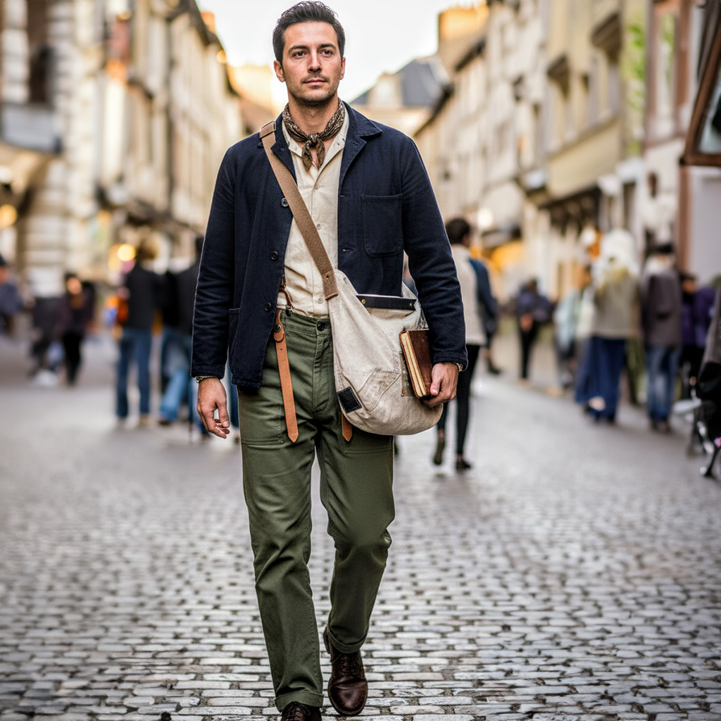 This piece fuses the tough, one-of-a-kind texture of vintage military material with playful design details inspired by painter pants.