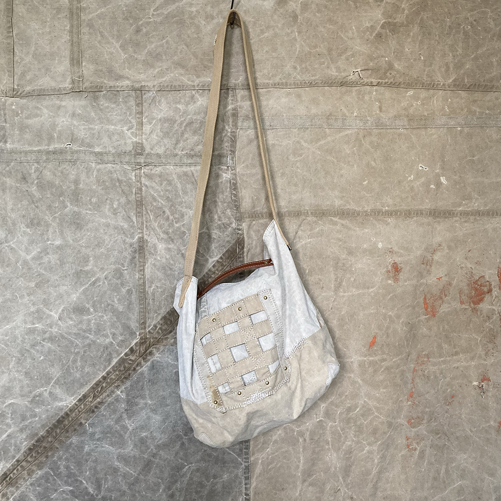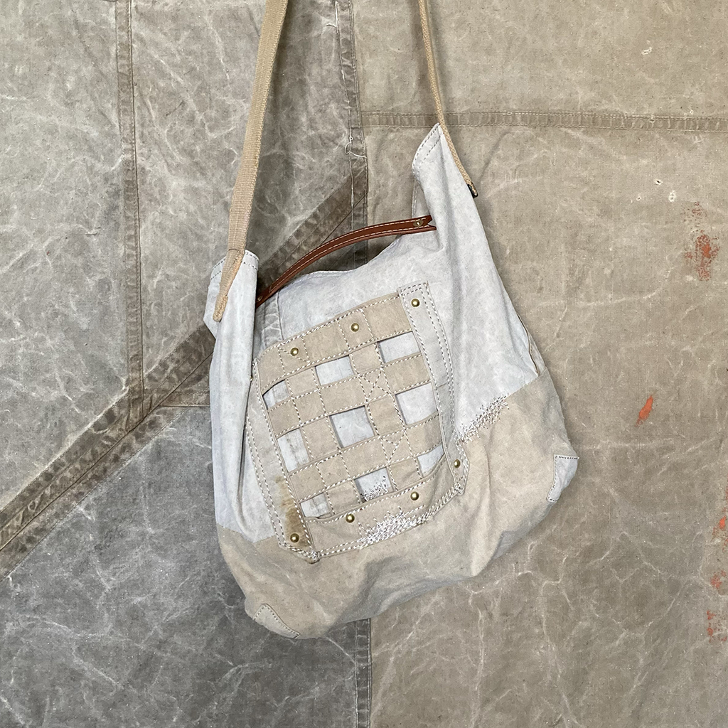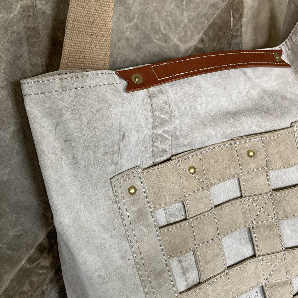 Crafted from durable military tent fabric, the double-layered body combines toughness with exceptional strength. To this rugged foundation, we’ve added a striking see-through grid pocket — a playful detail that invites you to show off your favorite small items or daily essentials.