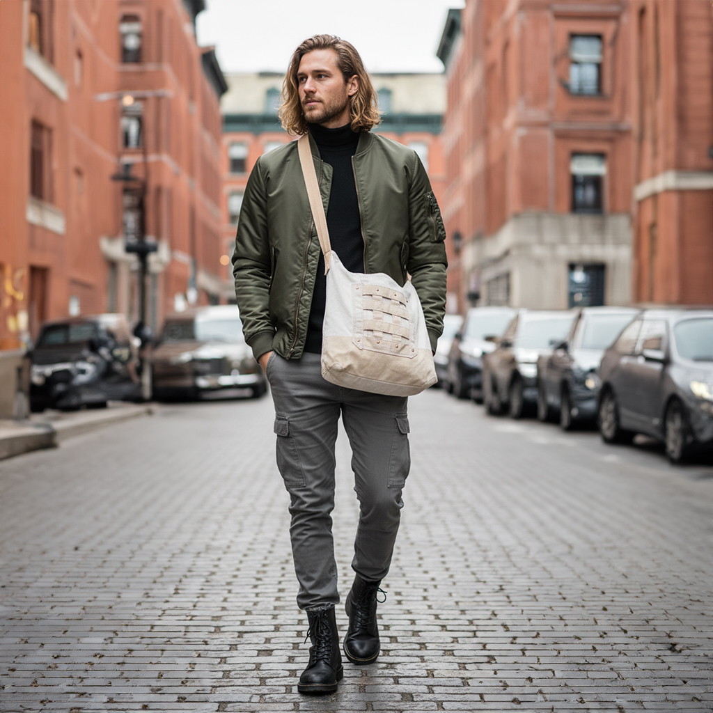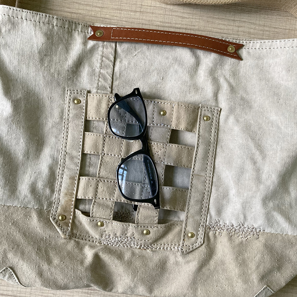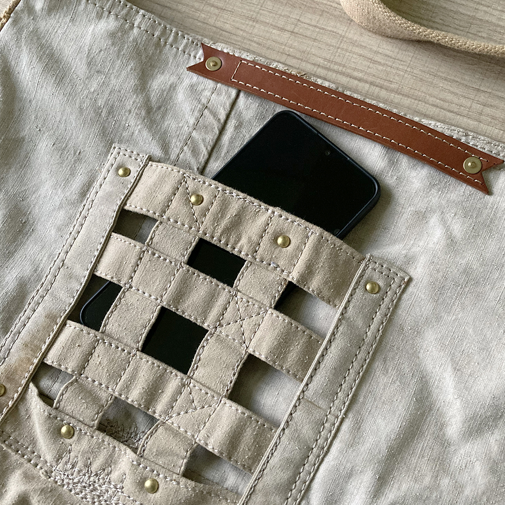 Crafted from durable military tent fabric, the double-layered body combines toughness with exceptional strength. To this rugged foundation, we’ve added a striking see-through grid pocket — a playful detail that invites you to show off your favorite small items or daily essentials.