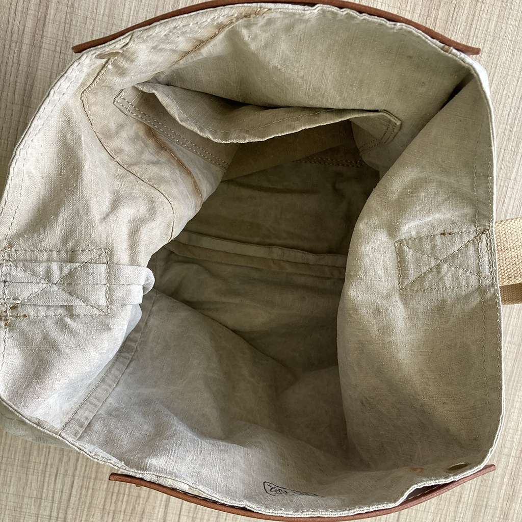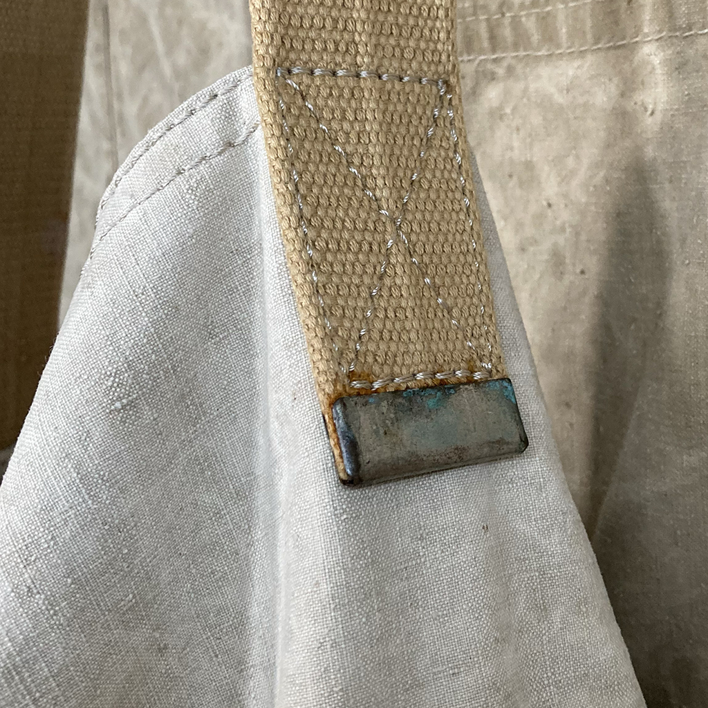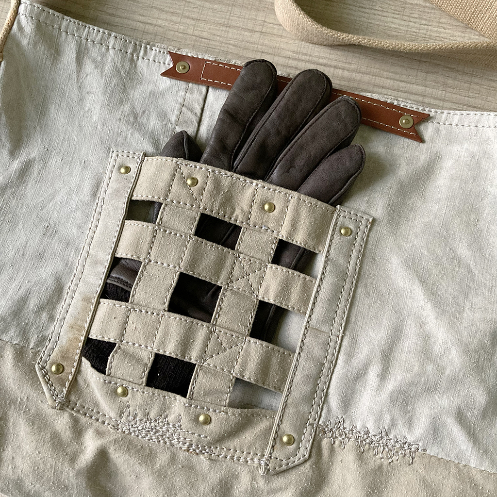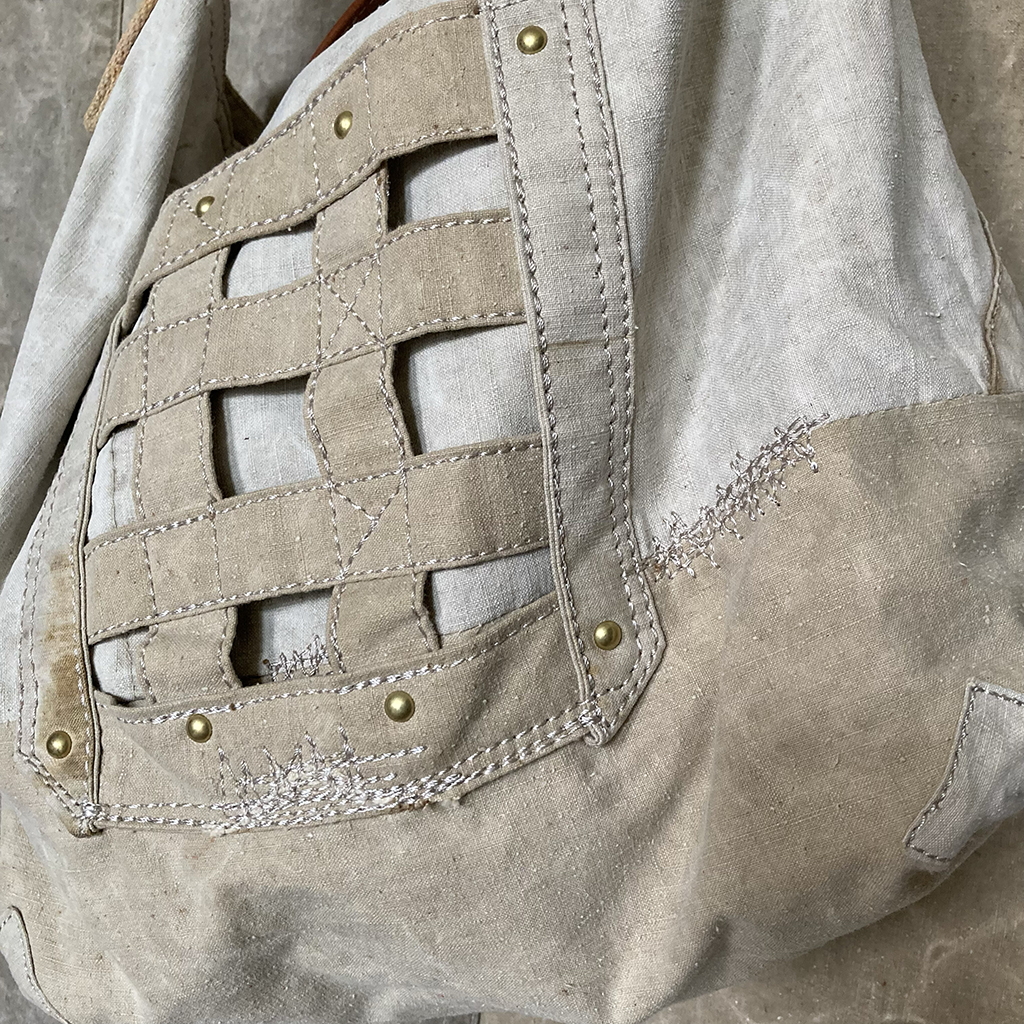 Brass rivets highlight the bag’s raw, utilitarian spirit, while the brand’s signature leather ribbon handles and thick cotton shoulder strap add a soft, warm contrast to the overall design.