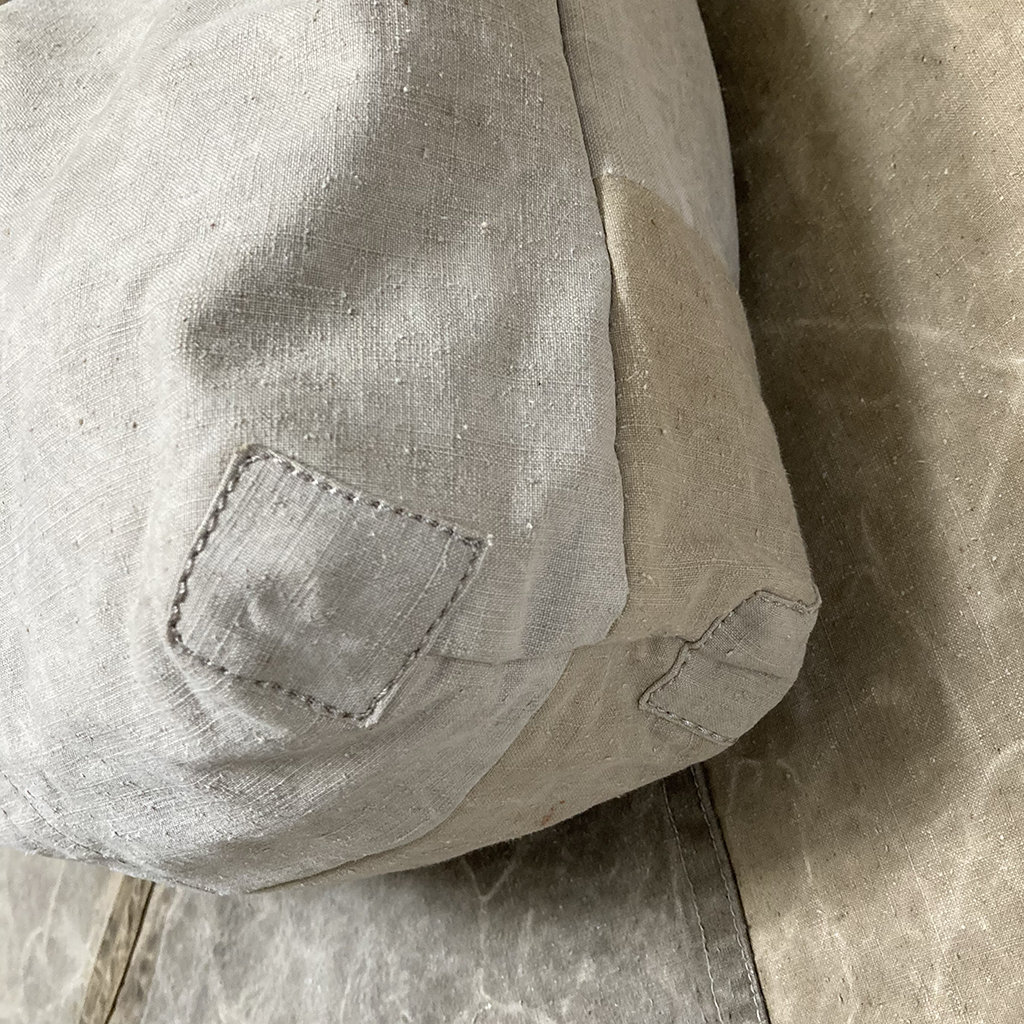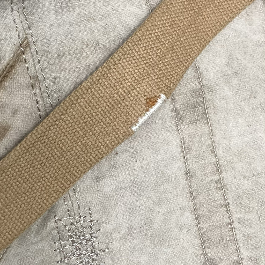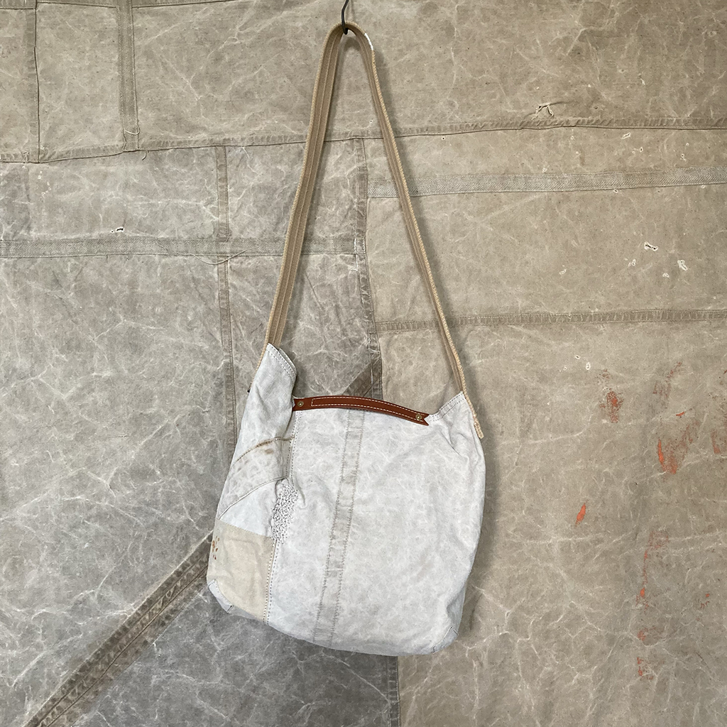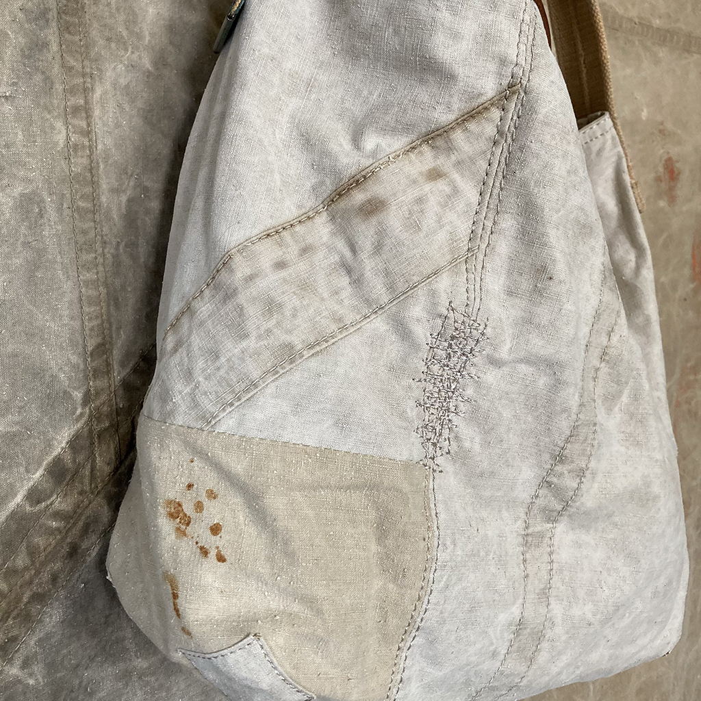 Brass rivets highlight the bag’s raw, utilitarian spirit, while the brand’s signature leather ribbon handles and thick cotton shoulder strap add a soft, warm contrast to the overall design.